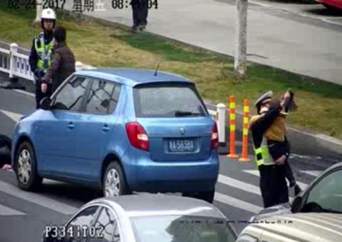 骑电动车母子路中被撞 年轻交通管理员抱娃执勤