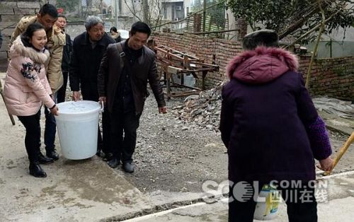 最近几天,黄桷村出现停水现象,段巧灵(左一)与驻村工作组成员帮助年长老人送水。