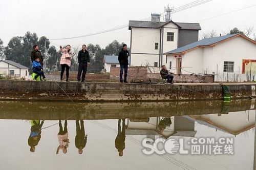 段巧灵(左三)在村民开办的鱼塘边收集游客对该村养殖业的意见。