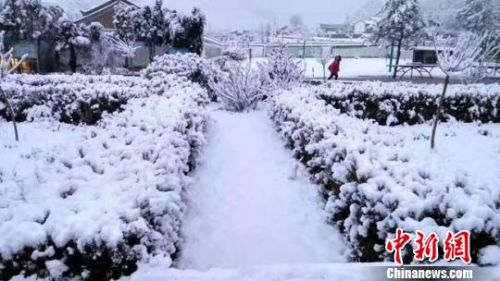 甘肃省气象部门预计,10日至14日,甘肃将出现大范围持续性雨雪天气,大部分地方气温将下降4℃至6℃。图为10日清晨,迎来降雪的甘肃陇南市宕昌县城。 钟欣 摄