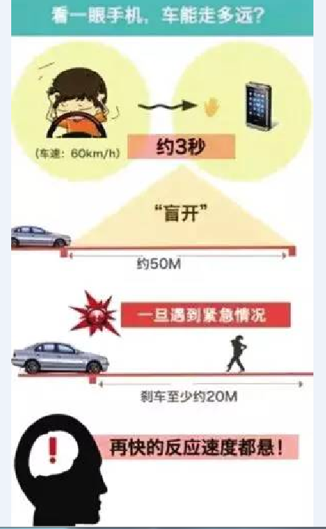 据了解,开车时打手机发生事故的概率是普通状态下的2.8倍;开车时看手机发生事故的概率是普通状态下的23倍。看一眼手机最少需要3秒,假如以60KM/h的时速开车,那么3秒钟就会盲开出50米,盲开极容易诱发各种各样的交通事故。