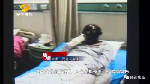 爆炸发生后一共有五个人受伤,视频中的这个人受伤较轻,但满头的头发已经明显被烧焦。而正在牌桌上打牌的四人都烧伤较重。