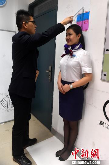 图为工作人员正在为通过形象初审的应聘者测量身高。 吕明 摄