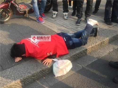 (原标题:震惊|杭州外卖小哥当街爬行送餐?他要爬到公司讨说法!(独家视频))