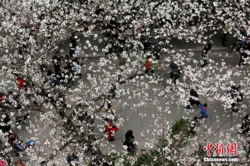 近日,武汉大学内樱花绽放,吸引众多赏花人前来观赏。 中新社记者 张畅 摄