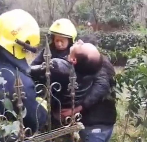 消防员用破拆工具将栅栏剪断,将男子放到地面上,期间男子难忍剧痛,不断大叫。
