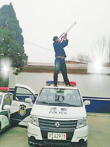 图片一:一名男子身着黑色衣服站在一辆车牌为豫C6291的警车车顶上,男子手中持有一杆疑似带瞄准镜的长枪,并做出朝天空射击的动作;