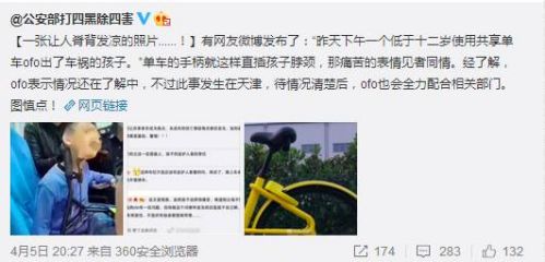 有网友在微博上发布消息称:一个低于十二岁使用共享单车ofo出了车祸的孩子。单车的手柄就这样插进了孩子的脖颈!!!