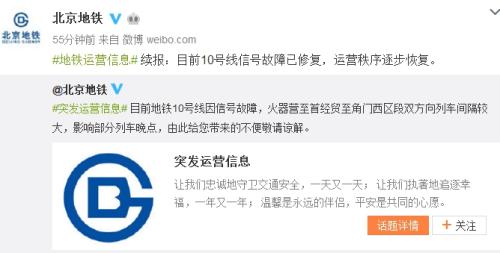 北京地铁10号线信号故障影响部分列车晚点 现已修复