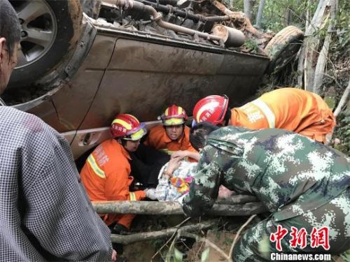 据现场施救的消防官兵介绍,事故车辆翻落山崖,卡在一片竹林中,车辆严重变形,挡风玻璃破碎。驾驶室一侧悬空,没有着力点,救援人员遂利用绳索固定事故车辆,在确保安全的情况下,由一名经验丰富的战士钻进变形的中巴车内,用剪扩器剪断座椅根部,开辟救援通道,把被困人员悉数救出。