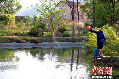暮春午后,微雨。江西省东北部,德兴市万村乡新屋村,张崇有站在池畔,忙着向池中抛洒鱼食。