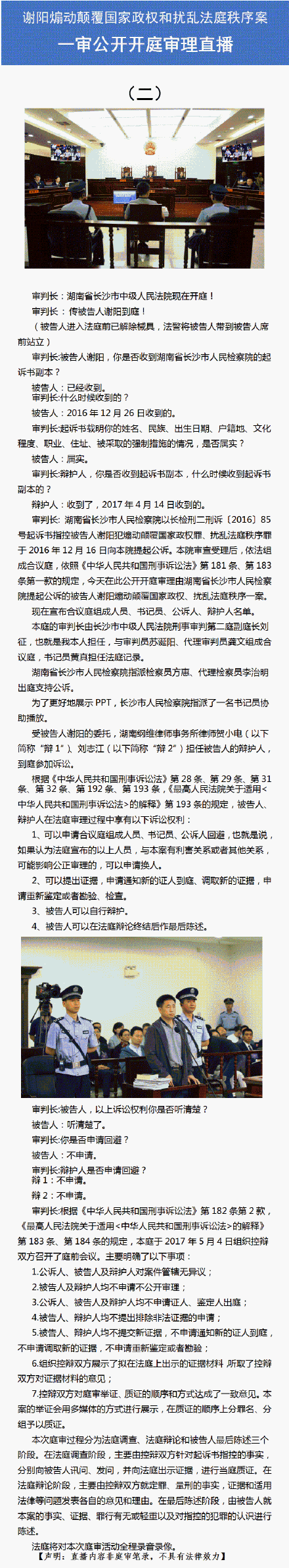 5月8日上午9时30分,长沙市中级人民法院一审公开开庭审理被告人谢阳煽动颠覆国家政权和扰乱法庭秩序案。长沙市人民检察院派员出庭支持公诉,谢阳及其委托的两名辩护人到庭参加诉讼。部分人大代表、政协委员、谢阳亲属、境内外媒体记者及各界群众40余人旁听庭审。