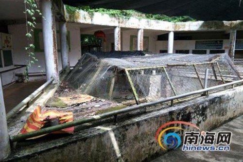5月8日中午,微博网友“默潭噢”参观完海口市金牛岭公园动物园后,在网上发表了感受:海口动物园绝对是我去过最惨无人道的动物炼狱,爬虫馆一半的蛇直接在玻璃箱里成了蛇干。蟒蛇,巨蜥,娃娃鱼是泡在福尔马林里的尸体。鳄鱼池水又浅又脏漂满了矿泉水瓶。哺乳动物刻板行为严重,老虎笼子空间很小,挤了两只孟加拉虎。黑熊在原地不停地点头……上述内容引起了记者关注,南海网记者赶到海口市金牛岭公园动物园进行了实地走访。