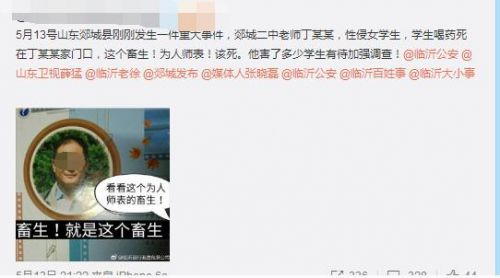 5月13日晚,临沂网友“临沂百行泡塑包装公司徐旭”微博报料称,13日临沂郯城县二中一高中女生遭老师丁某某性侵,女生受辱后喝药死在老师丁某某家门口。