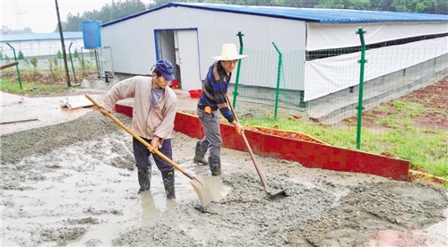 东源村村民在修建肉鸡养殖基地的消毒池。