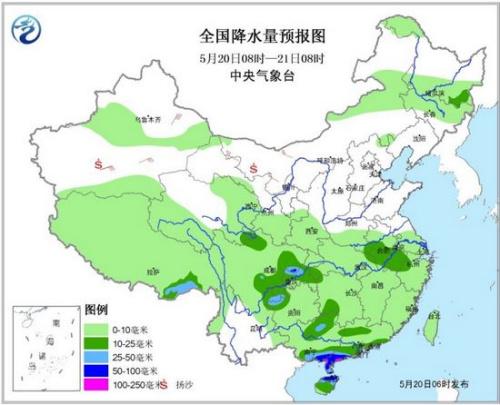 20日08时至21日08时,广西北部和南部、广东西部、海南岛大部、四川盆地东部和南部等地有中到大雨,其中广西东南部、广东西南部、海南岛北部等地的部分地区有暴雨,局地大暴雨(100-120mm);新疆南疆盆地、内蒙古中西部等地有4-6级风,南疆盆地的部分地区有沙尘天气。南海东北部、巴士海峡有6~7级风,阵风8~9级。