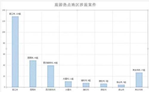 从行政区域划分来看,旅游热点地区涉旅案件查处占了全省的90.21%。其中:丽江市查处129起,占全省案件查处的46.74%;昆明市查处49起,占全省案件查处的17.75%;西双版纳州查处40起,占全省案件查处的14.49%;大理州查处11起,占全省案件查处的3.99%;迪庆州查处8起,占全省案件查处的2.90%;德宏州查处7起,占全省案件查处的2.54%;保山市查处5起,占全省案件查处的1.81%;其余州市共查处27起,占全省案件查处的9.79%。4月15日以来,省旅游市场秩序整治工作领导小组办公室督办转办各州、市涉旅案件42起,其中办结10起,正在办理32起。