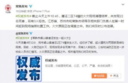 截止今天上午10:45,漕泾二区74幢的火灾现场清理结束,共发现22名死者,另有3人轻伤。江苏省、苏州市和常熟市领导及相关部门负责人在第一时间赶到现场指挥处置工作。火灾原因正在调查之中。我们将及时公布进展。