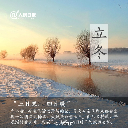 立冬后,冷空气活动开始频繁。保健专家提醒说,此时阳气潜藏,从养生的角度来看,起居调养应以“养藏”为主,建议早睡晚起,晨练的时间应适当推迟,一定要等到太阳升起、雾气消散之后;饮食上多吃滋阴的食物,可以开始适当进补,同时注意均衡饮食。(本文图片来源:人民日报微博)