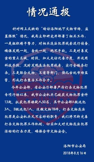 洛阳警方16日通报称,在获悉上述网络反映后,警方立即研究并部署,组织警力对相关违法犯罪线素进行侦查,对易发案的重点区城、时段,加大走访巡查力度,并运用科技手段,及时发现违法犯罪线素,实行全链条打击。同时,联合文物、工商等部门,强化古玩市场监管,形成打击整治工作合力。