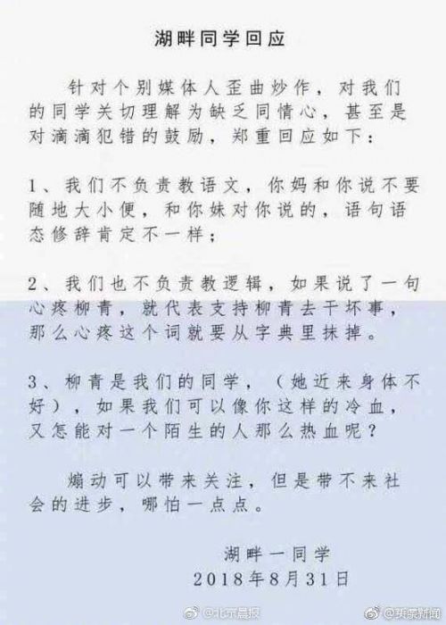 【网传湖畔大学学员回应为滴滴柳青加油:不负责教语文】湖畔同学:针对个别媒体人歪曲炒作,对我们的同学关切理解为缺乏同情心,甚至是对滴滴犯错的鼓励,郑重回应如下: 1。我们不负责教语文,你妈和你说不要随地大小便,和你妹对你说的,语句语态修辞肯定不一样。2。我们也不负责教逻辑,如果说了一句心疼柳青,就代表支持柳青去干坏事,那么心疼这个词就要从字典里抹掉。