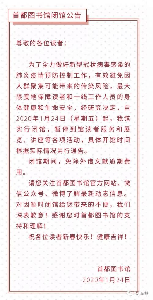今天凌晨,首都图书馆宣布,自1月24日(星期五)起实行闭馆,暂停到馆读者服务和展览、讲座等各项活动。