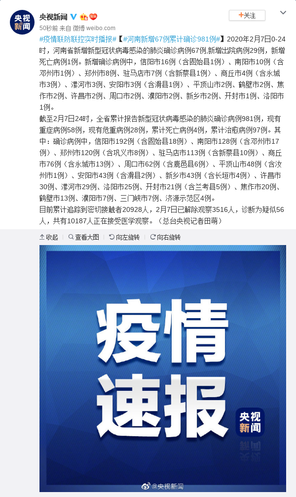 河南新冠肺炎最新疫情消息:新增确诊病例67例累计确诊981例