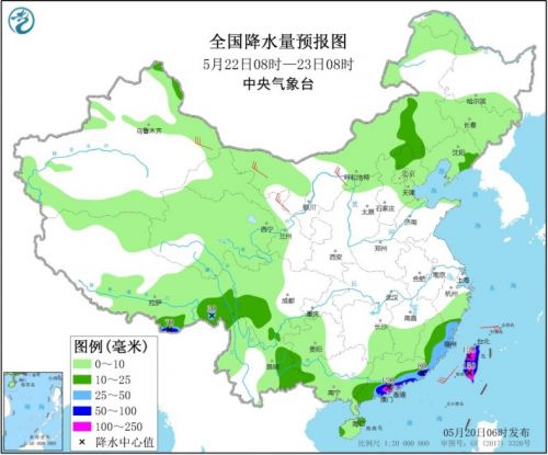 5月22日08时至23日08时,内蒙古东南部、辽宁东部、河北北部、西藏南部和东部、江南东部、四川南部、云南东部、华南南部、台湾岛等地的部分地区有中到大雨,其中,西藏南部、广东南部沿海、台湾岛等地的部分地区有暴雨或大暴雨(100~150毫米)。