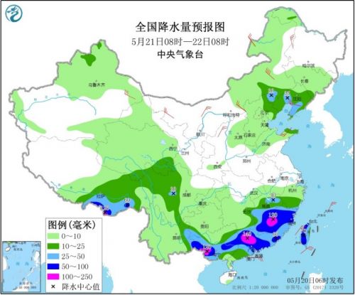 明天南方强降雨区域东移南压,预计5月21日08时至22日08时,内蒙古东南部、东北地区南部和西部、西藏东部、青海东南部、江南中南部、华南大部、台湾岛等地的部分地区有中到大雨,其中,西藏南部、江西中南部、福建大部、云南东南部、广西东部和西南部、广东西北部和中部、台湾岛大部等地的部分地区有暴雨或大暴雨(100~140毫米)。