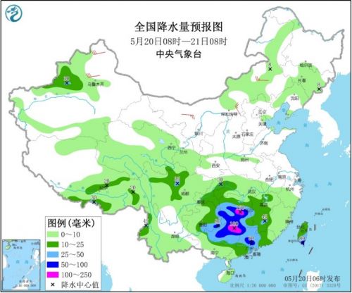中央气象台预计,5月20日08时至21日08时,重庆东部、贵州东部和南部、湖北西南部、湖南大部、江西大部、广西中北部、广东大部及新疆沿天山西段、西藏南部、川西高原北部、云南西北部、台湾岛等地有中到大雨,其中,湖南中南部、广西东北部、广东西北部和中部等地的部分地区有暴雨或大暴雨(100~180毫米)。