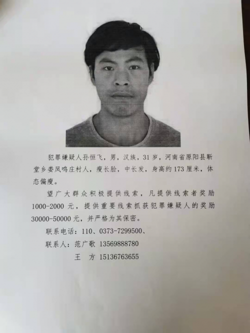 犯罪嫌疑人:孙恒飞,男,汉族,1989年2月10日出生,身份证号码:410725198902105732,河南省原阳县靳堂乡娄凤鸣庄村人,在多个家具厂打过工(油漆工),曾干过泥瓦工,爱好钓鱼,痩长脸,中长发,身高约173厘米,体态偏痩,案发前身着上蓝灰色、下桔黄色、中间印有字母的上衣(可能携带一件上黑色、下蓝色薄棉袄),脚穿深色休闲鞋,左手腕外侧有烟头烫的伤疤,后右腰处有黄豆大黑痣。