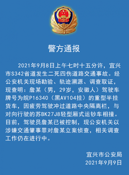 宜兴发生2死4伤道路交通事故 警方通报事故原因