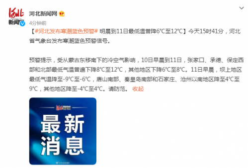 【#河北发布寒潮蓝色预警# 明晨到11日最低温普降6℃至12℃】今天15时41分,河北省气象台发布寒潮蓝色预警信号。