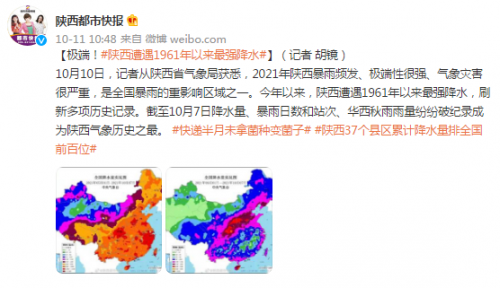 10月10日,记者从陕西省气象局获悉,2021年陕西暴雨频发、极端性很强、气象灾害很严重,是全国暴雨的重影响区域之一。今年以来,陕西遭遇1961年以来最强降水,刷新多项历史记录。截至10月7日降水量、暴雨日数和站次、华西秋雨雨量纷纷破纪录成为陕西气象历史之最。(记者 胡镜)