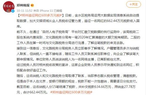 郑州金水区税务局追征一网红600多万元税款