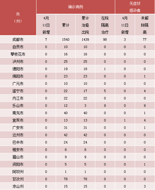 4月11日0时至24时,四川新增本土确诊病例2例 (在成都市),无新增本土无症状感染者,新增境外输入确诊病例5例 (均在成都市,其中2例为既往通报的无症状感染者转确诊),新增境外输入无症状感染者4例 (成都市3例,宜宾市1例),新增治愈出院病例8例,无新增疑似病例,无新增死亡病例。