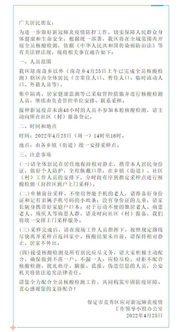 保定市竞秀区发布关于开展全员核酸检测的通告