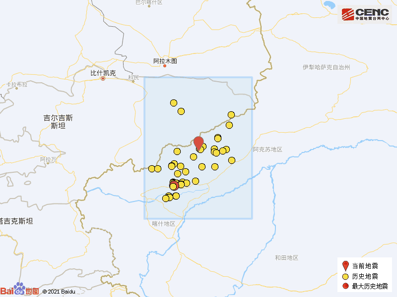 历史地震: 根据中国地震台网速报目录,震中周边200公里内近5年来发生3级以上地震共173次,最大地震是2020年1月19日在新疆喀什地区伽师县发生的6.4级地震(距离本次震中145公里),按震级大小前50次历史地震分布如图。