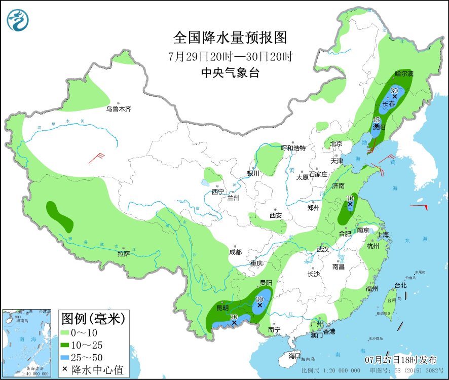 7月29日20时至30日20时,东北地区中部、江淮北部、西南地区东南部、广西西部、西藏西南部等地部分地区有中到大雨(25~45毫米)。新疆南疆盆地、山东半岛等地部分地区有4~6级风(见图5)。