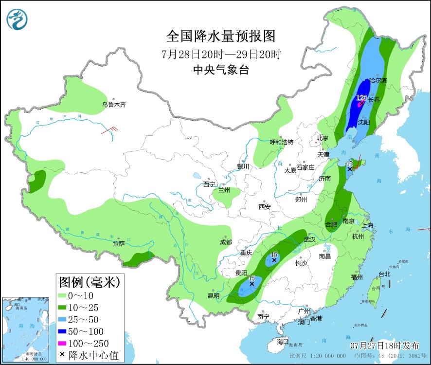 7月28日20时至29日20时,东北地区中西部、黄淮东部、江淮、江汉、西南地区东南部等地部分地区有中到大雨,其中,吉林西部、辽宁中部等地部分地区有暴雨,局地有大暴雨(100~120毫米)。新疆南疆盆地、山东半岛等地部分地区有4~5级风(见图4)。