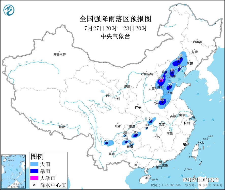 预计,7月27日20时至28日20时,京津冀地区、内蒙古东南部、辽宁西部、山东北部和西部、河南东部以及湖北中部、贵州东北部和中部、四川南部等地的部分地区有大到暴雨,河北中部等地局地有大暴雨(100~200毫米);上述部分地区伴有短时强降水(最大小时降雨量30~50毫米,局地可超过70毫米),局地有雷暴大风等强对流天气(见图2)。中央气象台7月27日18时继续发布暴雨蓝色预警。