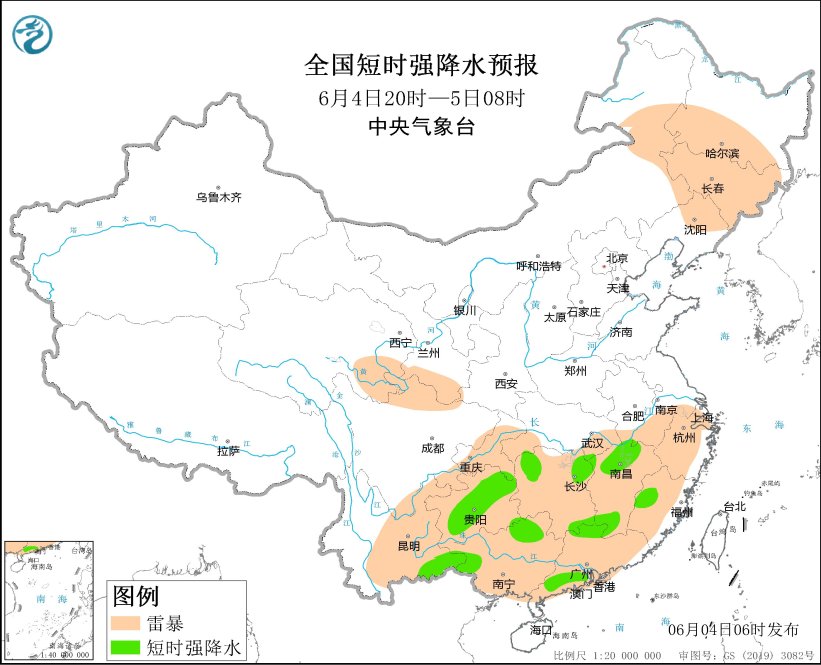 预计4日08时至5日08时,贵州、云南东南部、湖南北部和南部、江西北部和南部、广西北部、广东中部、福建北部、海南岛西部、台湾岛南部等地的部分地区将有短时强降水天气,小时雨量20-50毫米,局地可达60毫米以上;另外,江西南部等地的局地将有雷暴大风或冰雹天气。