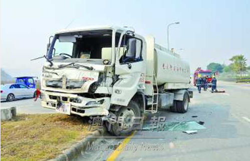 12日上午11时许,在澳门莲花路近东亚运体育馆对开,ML五四XX号拖头转弯期间,随后一辆满载燃油的MN七三XX运油车驶至,疑有人收掣不及,猛撞拖头尾架,惟去势未止,失控撞毁石壆,挡风玻璃飞脱,碎片遍地。撞击巨响吓煞拖头司机,有人停车查看并报警。由于运油车满载燃油,幸撞击未波及油缸,否则酿成爆炸,后果堪虞。