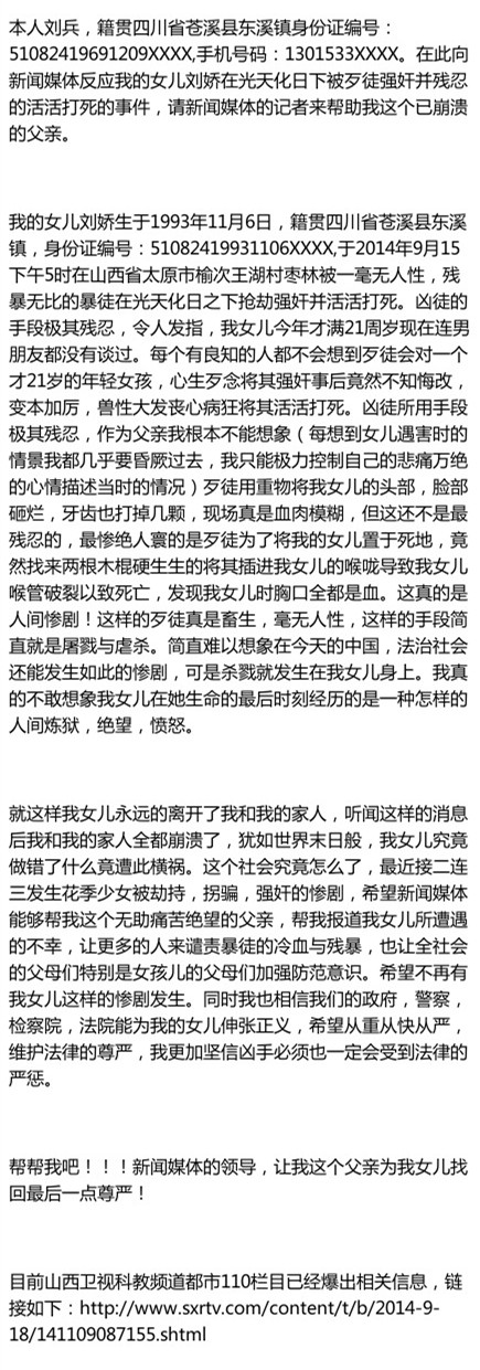 广元苍溪女孩刘娇,随父母到山西务工,9月15下午5时,在山西太原榆次王湖村枣林被一暴徒在光天化日之下抢劫强奸并活活打死。凶徒所用手段极其残忍,歹徒用重物将女孩头脸砸烂,还将木棍插入其喉咙。