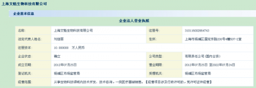 澎湃新闻记者还发现,在上海市工商行政管理局网站上,“上海文魁生物科技有限公司”的注册信息显示,该公司成立于2012年07月25日,营业期限至2022年07月24日,注册资本10万人民币,法人代表刘佳丽,注册地址为上海杨浦区国定东路200号4幢507-2室(即复旦大学科技园),营业范围为“从事生物科技领域内技术开发、技术咨询,一类医疗器械销售”。