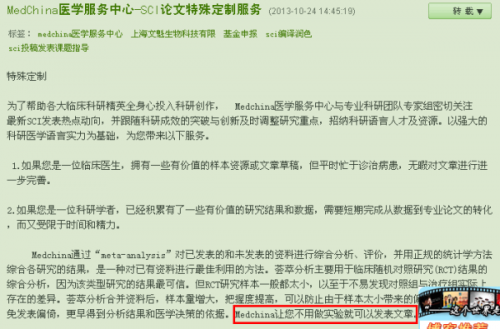 MedChina公司官网截屏图,空色框内的文字为:MedChina让您不用做实验就可以发表文章。