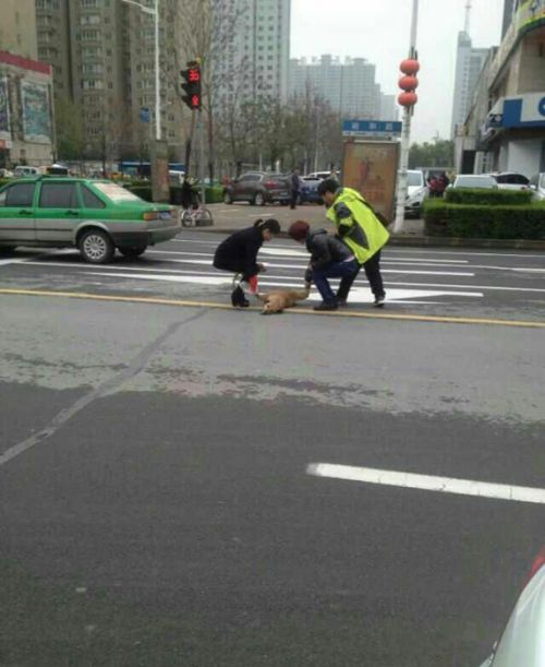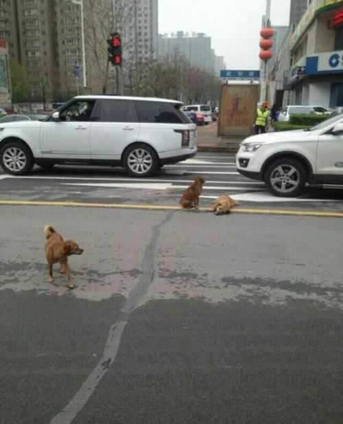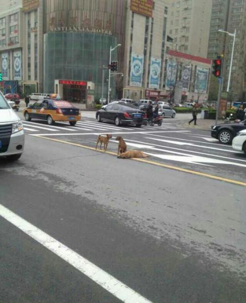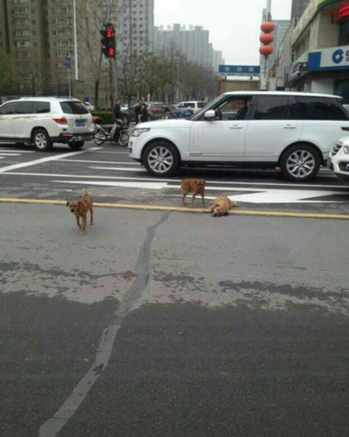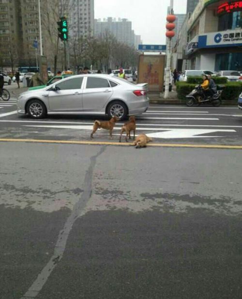 黄狗病倒躺路中间 两同伴守护不离不弃