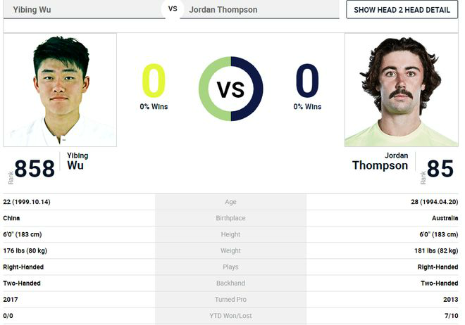 本次比赛,吴易昺从资格赛脱颖而出跻身正赛,现世界排名仅为858位的他将在第二轮挑战世界排名第237位的博纳迪奥。