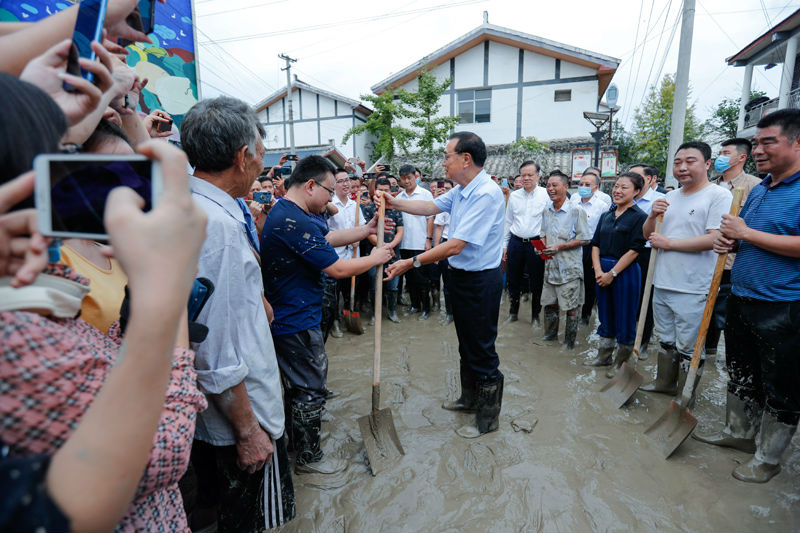 李克强8月20日上午11时许飞抵重庆,一下飞机马上转乘火车、汽车,一路辗转来到洪水灾情严重的潼南区双坝村。李克强对当地干部和随行人员说,要落实好习近平总书记对防汛救灾和灾后重建工作的重要指示精神,确保人民群众的生命财产安全。双坝村位于涪江沿线,全村8000多人全部受灾,屋内积水最高时达一人多高,村庄周围的农田、蔬菜大棚全部损毁。总理沿途看望慰问受灾群众,走进水毁房屋、受灾农田和灾民安置点等,询问大家有什么具体困难,需要国家哪些政策支持。总理表示,党和政府一定会帮助大家渡过难关。村民们告诉总理,我们从来没有见过这么大的洪水,很多在外打工的人都回家来救灾,所幸没有造成人员伤亡。李克强说,家是最有凝聚力的,这么大的灾害大家一起努力顶住了,没有人员伤亡就是最大的胜利。你们这里涪江、嘉陵江几条江上过去都有纤夫,涪江的号子是很雄壮的。你们现在的行动实际上也是在唱响涪江号子,大家齐心协力,就一定能够把家园重新建设好。