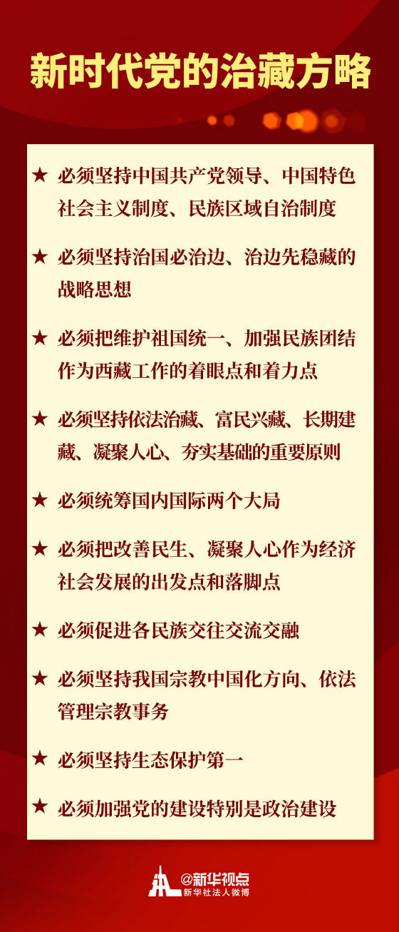 例如,明确提出“必须把维护祖国统一、加强民族团结作为西藏工作的着眼点和着力点”;在过去表述基础上,把“必须统筹国内国际两个大局”单列一条;进一步提出“必须坚持我国宗教中国化方向、依法管理宗教事务”;更加鲜明地提出“必须加强党的建设特别是政治建设”。